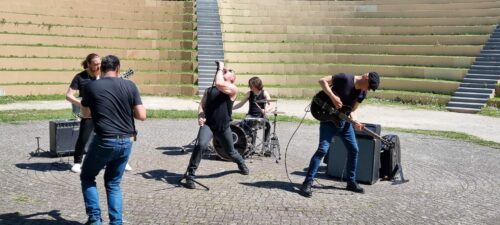 Le clip s’est effectué en plusieurs étapes. Il y a eu la première phase qui était de nous filmer dans un cadre original et surprenant en extérieur en situation «live». Comme souvent, on cherche loin alors que ce dont on a besoin est souvent sous nos yeux. C’est donc à Torcy, juste à côté des studios de la Forge A Sons où nous avons enregistré notre single, que se trouvait le lieu idéal : Le « Théâtre de verdure » de Torcy qui venait d’être restauré. Le temps étant de notre côté le tournage prévu s’est déroulé sans accroc ! (A part quelques coups de soleils et des passants curieux avec qui nous avons discuté)